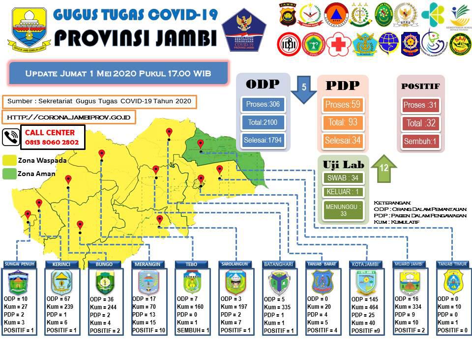 JAMBI – LINTAS.CO.ID – Tim Gugus Tugas Penanganan Covid-19 Provinsi Jambi kembali mengupdate data perkembangan terbaru virus Corona, pada Jumat (01/05/2020) sore.