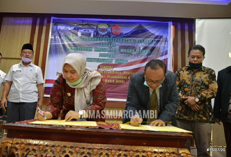 Muaro Jambi – Bupati Muaro Jambi, Hj Masnah Busro, melakukan Penandatanganan Kesepakatan Bersama antara Pemerintah Kabupaten Muaro Mambi (15/7), dengan Universitas Jambi.