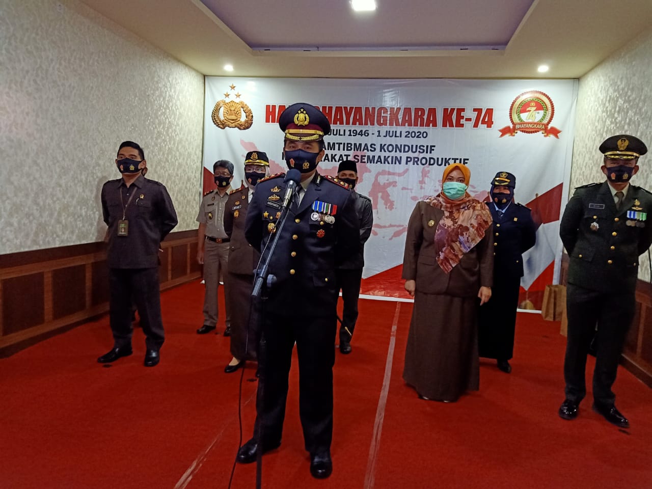 Peringati Hari Bhayangkara ke 74 yang jatuh pada rabu tanggal 01 juli 2020, Polres Muaro Jambi menggelar upacara Virtual dan syukuran Hari Bhayangkara ke-74 tahun 2020, Di Mapolres Muaro Jambi pada Rabu pagi (01/07/20).