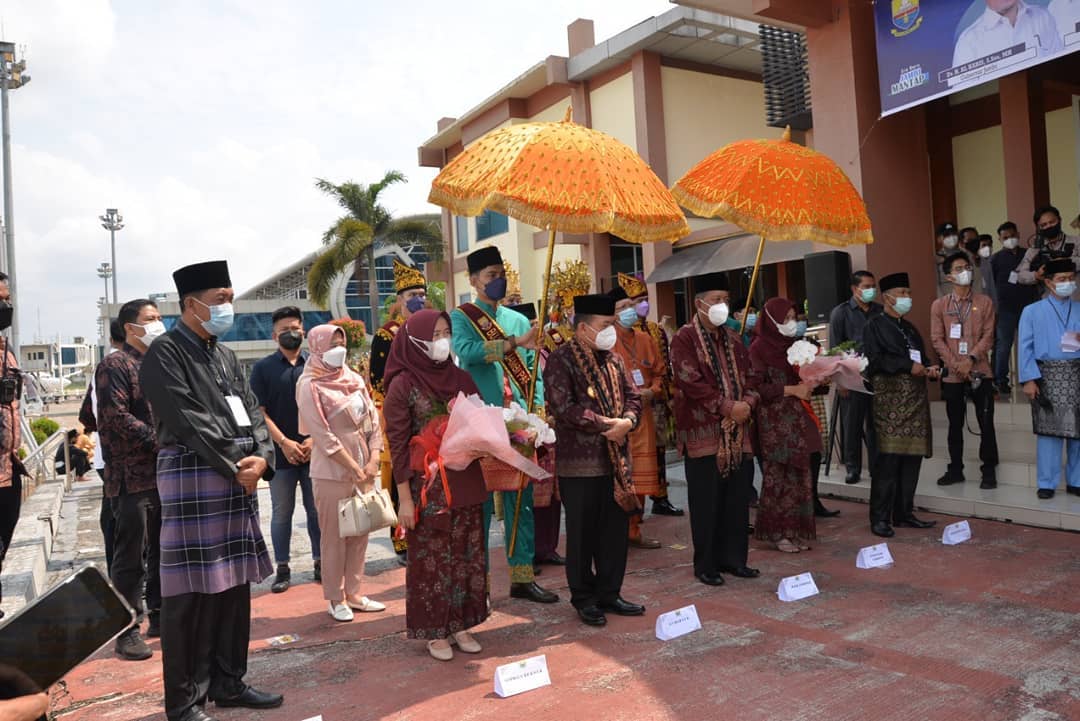 Jambi – Gubernur dan Wakil Gubernur Jambi terpilih Periode 2020-2024 Jambi Dr. H. Al Haris, S.Sos dan Drs. H. Abdullah Sani, M.Pd.I tiba di Jambi pada, Kamis (8/7). Keduanya baru kemarin dilantik oleh Presiden Joko Widodo di Istana Negara di Jakarta. Gubernur bersama rombongan disambut oleh Ketua Lembaga Adat Melayu, Forkompinda Provinsi Jambi serta sejumlah tokoh dan pejabat lainya. Tarian Sekapur Sirih dan Pencak Silat khas melayu Jambi pun tak ketinggalan dalam prosesi penyambutan orang nomor satu dan dua di Provinsi Jambi tersebut. Tiba di ruang tunggu VVIP Bandara Sultan Thaha Jambi, Al Haris dan Abdullah Sani didampingi istri masing-masing langsung menuju konferensi pers.