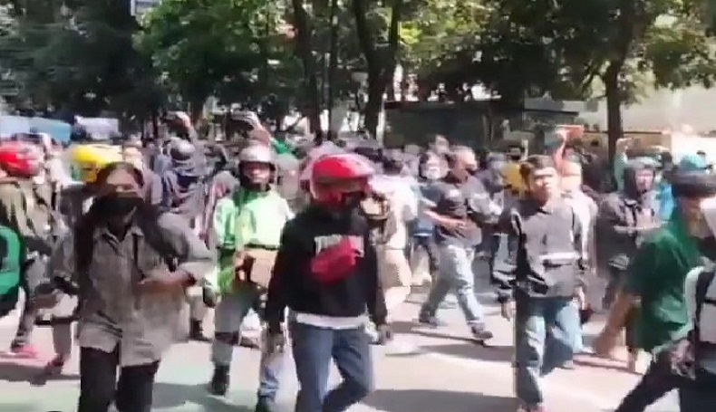 Bandung – Ratusan massa dari berbagai elemen seperti Literasi Pemuda Bandung, driver ojek online, dan perwakilan pedagang, mengontrog (mendatangi) Balai Kota Bandung, Jalan Wastukencana, Kota Bandung, Rabu (21/7/2021). Mereka datang untuk berunjuk rasa menolak PPKM Darurat. Sebelum berkumpul di Balai Kota Bandung, massa driver ojek online sempat berkonvoi melintasi beberapa ruas jalan di Kota Bandung. Mereka juga menyuarakan agar beberapa penyekatan jalan di Kota Bandung dibuka.