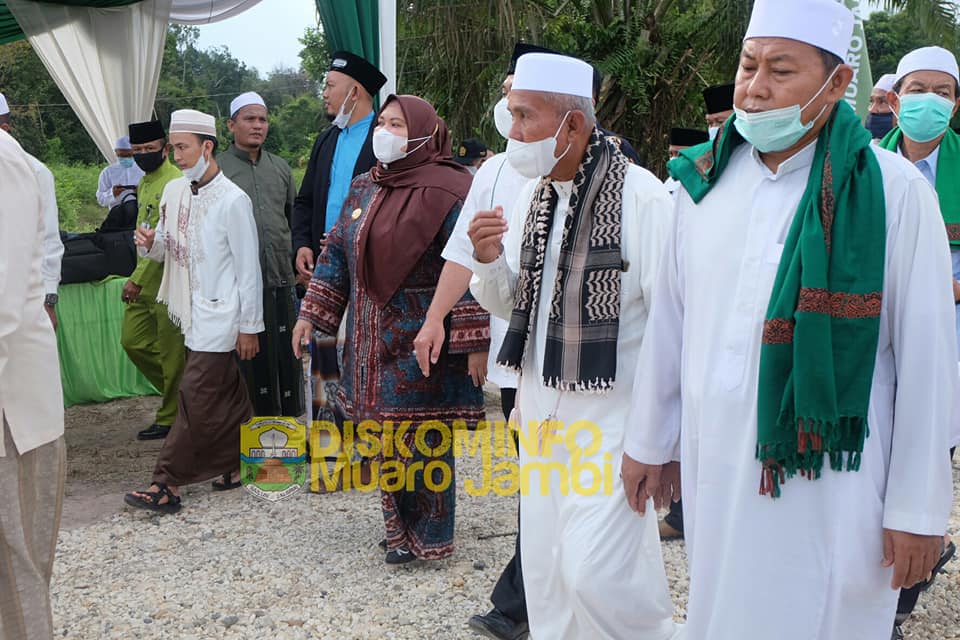 Muaro Jambi – Bupati Muaro Jambi Hj. Masnah Albusyro, SE, M.Tr.IP dampingi Anggota DPR RI Drs. H. Hasan Basri Agus, MM pada acara peletakan batu pertama pembangunan Masjid Ness Daarut Tauhid.