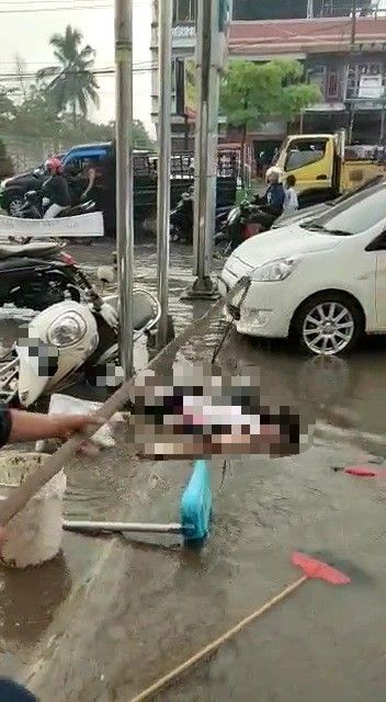 JAMBI– Banjir di depan Fresco jalan Pattimura memakan korban, seorang Laki-laki yang mau berbelanja mereggang nyawa di karenakan menyengol tiang anjungan tunai mandiri (ATM) yang terletak di depan swalayan tersebut, Kamis sore (5/8/2021).