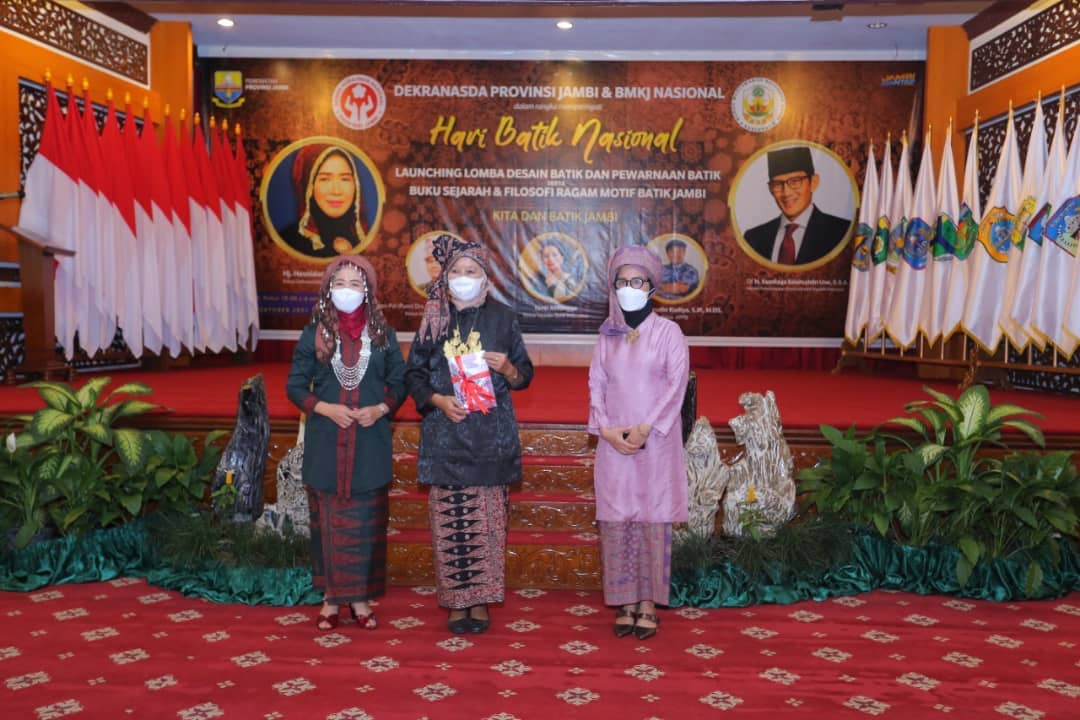 Jambi – Ketua Dekranasda Provinsi Jambi Hj. Hesti Haris, SE membuka Acara Peringatan Hari Batik Nasional dengan Tema”Kita dan Batik Jambi” sekaligus Launching Buku Sejarah dan Filosofi Motif Batik Jambi di Auditorium Rumah Dinas Gubernur Jambi, Sabtu (09/10/2021)