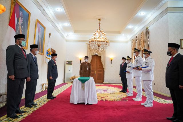 Jambi – Gubernur Jambi Dr. H. Al Haris, S.Sos, MH melantik penjabat bupati Kabupaten Muarojambi, Bachyuni Deliansyah, Kabupaten Sarolangun Hendrizal dan Kabupaten Tebo Aspan. Bertempat di auditorium rumah dinas gubernur Jambi, Minggu (22/05/2022).