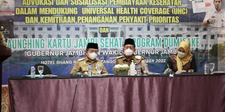 Jambi – Gubernur Jambi Dr.H.Al Haris,S.Sos.,M.H., menegaskan, Pemerintah Provinsi Jambi sangat berkomitmen untuk terus berupaya dalam mensejahterakan masyarakat Provinsi Jambi, salah satunya dengan memberikan Kartu Jambi Sehat kepada masyarakat. Hal tersebut ditegaskan Al Haris pada Advokasi dan Sosialisasi Pembiayaan Kesehatan dalam mendukung Universal Health Governance (UHG) dan Kemitraan Penyakit Prioritas serta Launching Kartu Jambi Sehat, yang berlangsung di Hotel Shang Ratu, Selasa (06/09/2022).