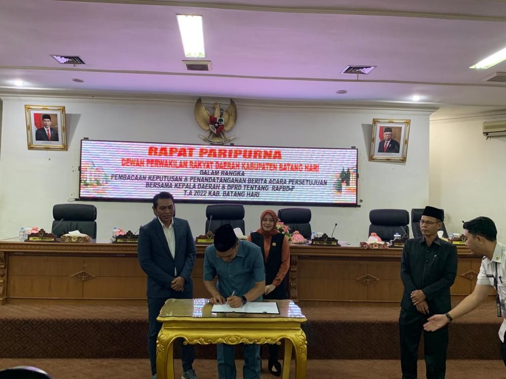 Batanghari – Bupati Batanghari Muhammad Fadhil Arief (MFA) hadiri rapat paripurna terkait Pembacaan putusan penanda tanganan nota kesepakatan tentang perubahan Anggaran Pendapatan Belanja Daerah (APBD) Kabupaten Batanghari tahun 2022.