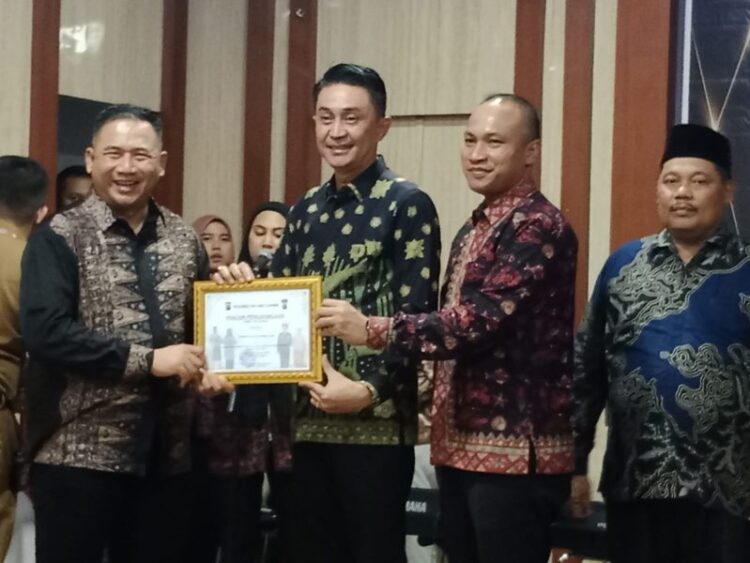 Muaro Jambi – Pj Bupati Muaro Jambi Bachyuni Deliansyah.SH. MH menerima piagam penghargaan dalam acara penyambutan Kapolres Muaro Jambi dari AKBP Yuyan Priatmaja SIK. MH kepada AKBP Muharman Artha SIK, Acara berlangsung di aula rumah dinas Bupati Muaro Jambi. Selasa (10/01/23) Malam.